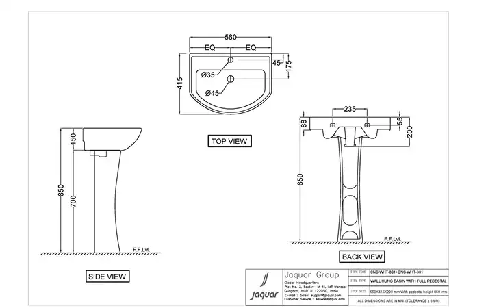 JAQUAR CNS-WHT-801 WALL HUNG BASIN WITH FIXING ACCESSORIES SIZE: 560X415X200 MM In Stock
