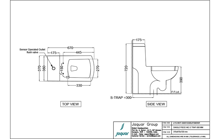 Single Piece WC With UF Soft Close Slim Seat Cover, Hinges, Sensor & Manual Operated Single Flush Cistern Fitting, Fixing Accessories And Accessories Set, Size: 370x670x720 mm, S Trap- 300 mm