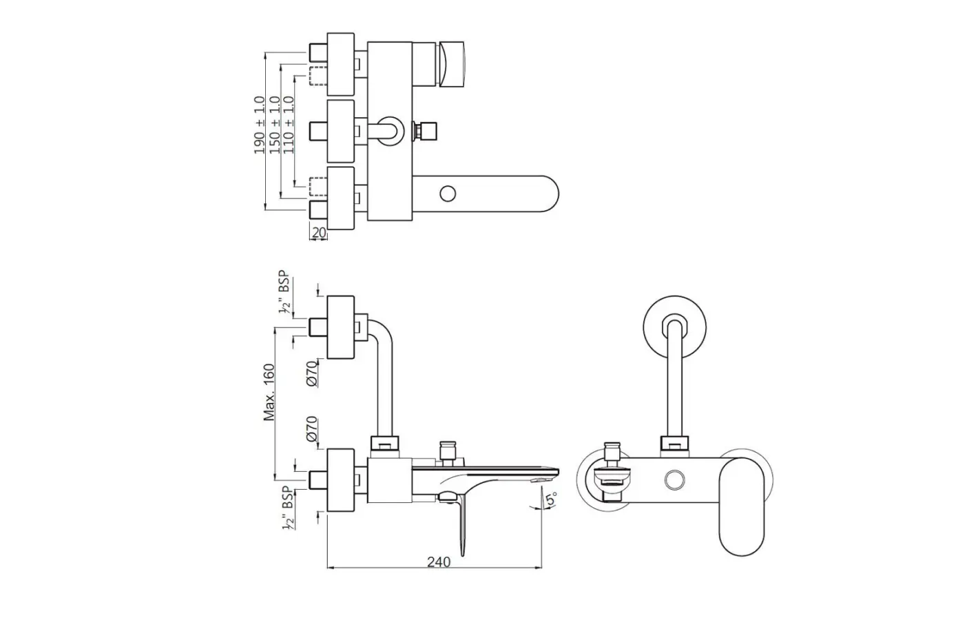 Single Lever Bath & Shower Mixer 3-in-1 System with Provision for both Hand Shower and Overhead Shower Complete with 115mm Long Bend Pipe on Upper Side, Wall Mounted