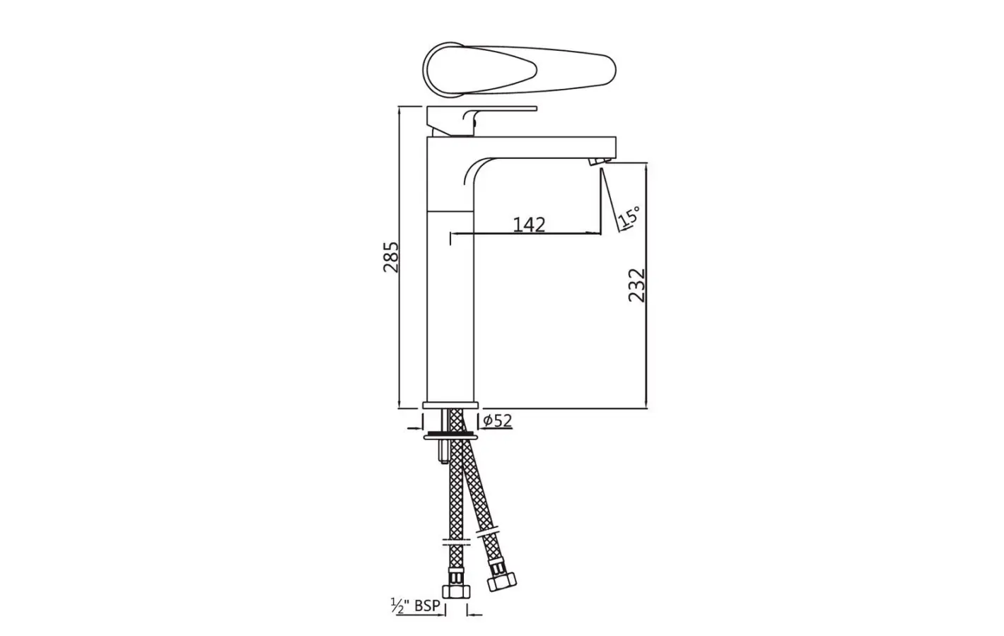 Single Lever High Neck Basin Mixer without Popup Waste, with 600mm Long Braided Hoses